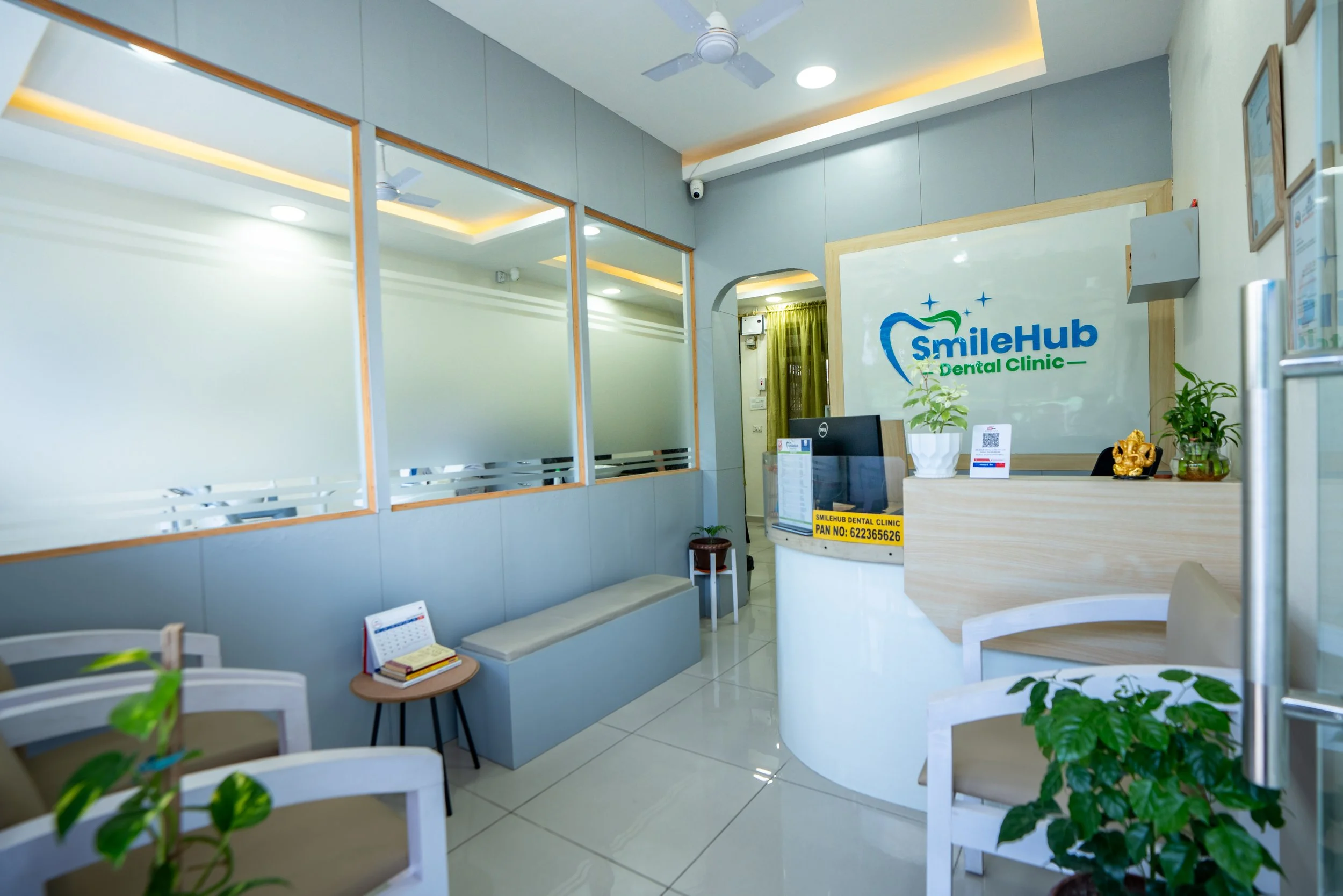 Interior of a dental clinic reception area with chairs, plants, and a front desk with SmileHub Dental Clinic signage.